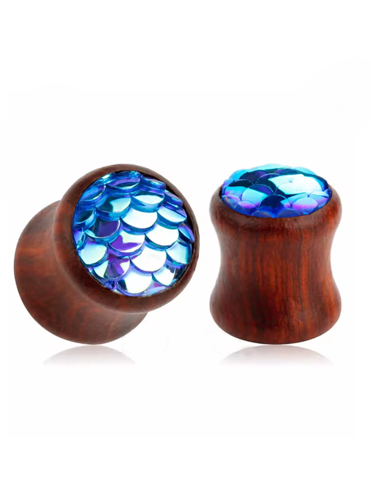 Плаги из красного сандалового дерева с синими акриловыми чешуйками с хамелеон-эффектом.