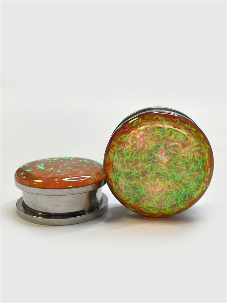 Плаги из стали 304 марки с блестящей накладкой в оранжевых оттенках.