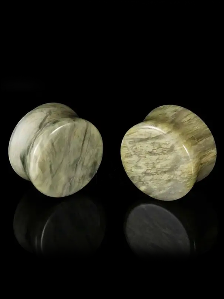 Плаги из зеленого шелкового нефрита. В виду натуральности материала каждое украшение имеет индивидуальный: узор камня, насыщенность, количество прожилок и их оттенок